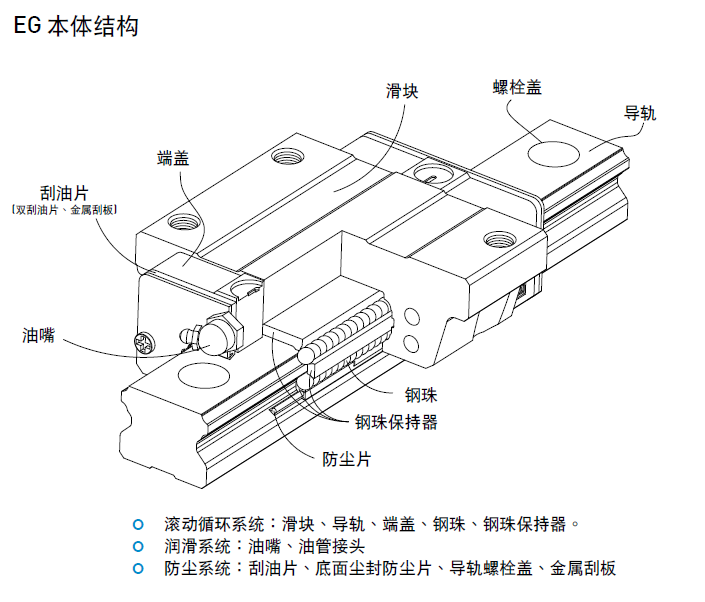 EG系列使用四列鋼珠承受負荷設計,使其具備高剛性、高負荷的特性,同時具備四方向等負載特色、及自動調心的功能,可吸收安裝面的裝配誤差,得到高精度的訴求;加上降低組合高度及縮短滑塊長度,非常適合高速自動化產業機械及空間要求的小型設備使用。