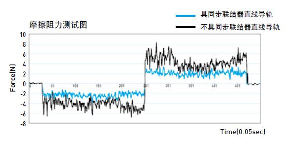 傳統(tǒng)不具同步聯(lián)結器之直線導軌開始運行時,負荷側的鋼珠會先運動,再推擠方向回轉部與無負荷側內的鋼珠,造成連鎖的來回碰撞,使得摩擦阻力變動起伏劇烈。而采用SynchMotionTM技術的QH系列直線導軌由于具有同步聯(lián)結器,將同一循環(huán)內的所有鋼珠串聯(lián)在一起,所以當滑塊開始運動時,所有鋼珠幾乎同時啟動,且鋼珠間并無來回的碰撞,在保持一定的運動慣性下,摩擦阻力的變動幅度能有效的減少。