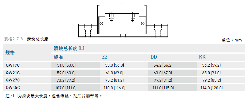 3、 防塵代碼之滑塊總長(zhǎng)度及規(guī)格對(duì)照表,請(qǐng)訂直線導(dǎo)軌的時(shí)候一定要確認(rèn)清林,以便出錯(cuò)